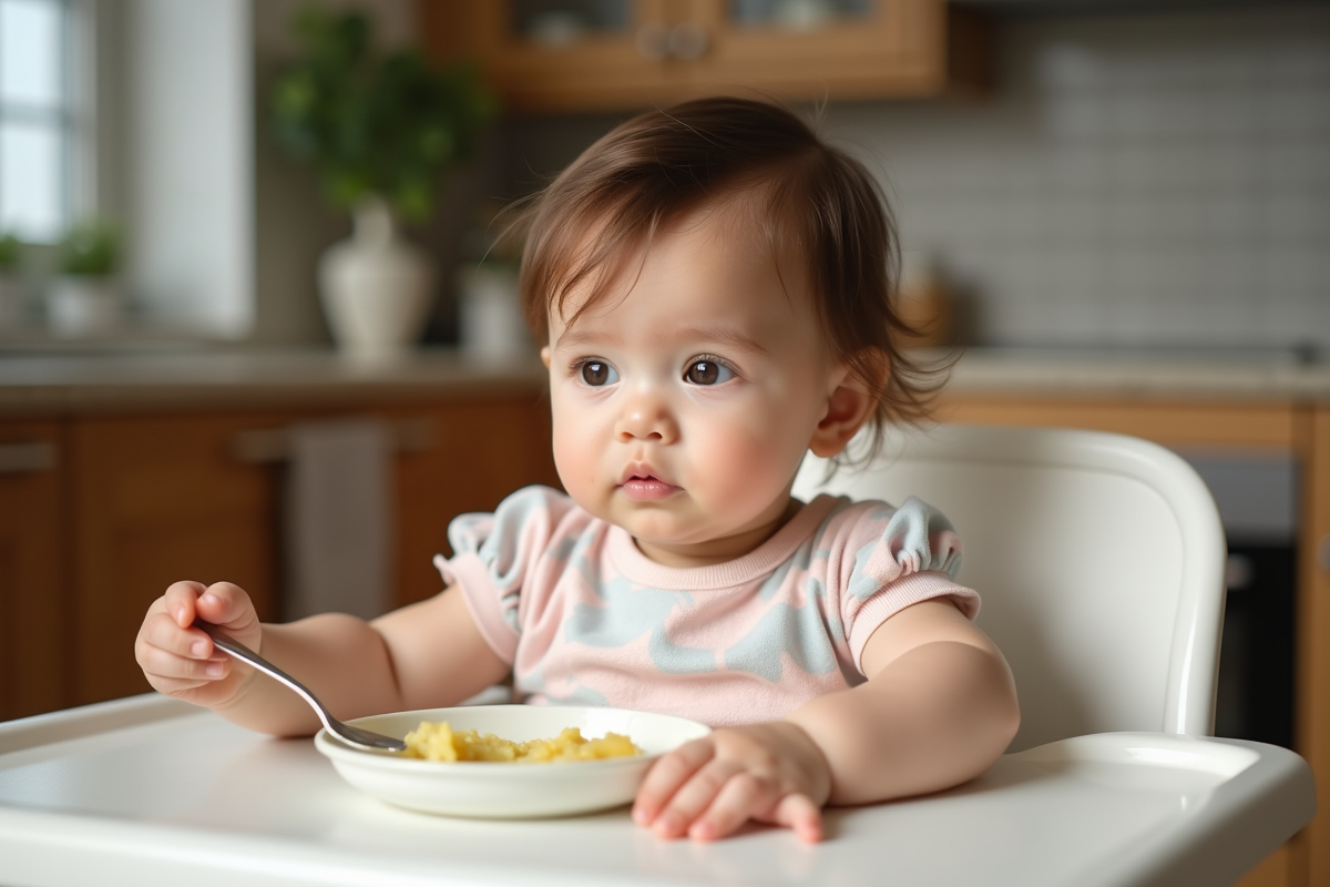 Les textures évoluent aussi : purée lisse (carotte, courgette) dès 4-6 mois, compote de poire ou de pomme, puis purée plus épaisse et morceaux fondants vers 8 mois. Dès que l’enfant tient assis et attrape la nourriture, la DME (Diversification Menée par l’Enfant) devient une option : bâtonnets de légumes vapeur, quartiers de fruits très mûrs, toujours sous la vigilance d’un adulte.